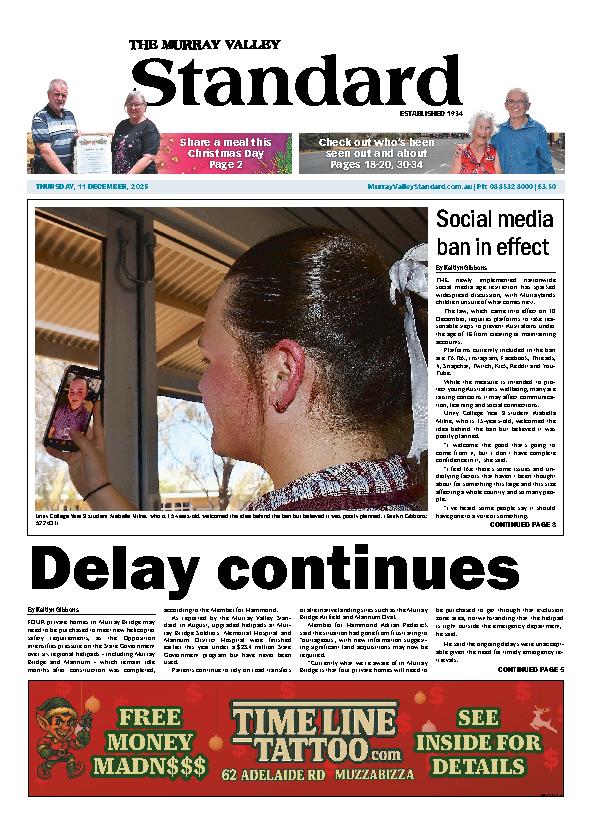 The Murray Valley Standard – 11th December 2025 Subscribe or Login to see the rest of the content. Username Password * Remember Me Forgot Password News Weekend crowd turns out 13/01/2026 Sport returned to the Murraylands on the weekend, with a strong crowd gathering to watch the local lawn bowls competition, while a raceday meet... Have your say on plan 12/01/2026 The Murraylands and Riverland Landscape Board has invited the community to have its say on the draft 2026–2031 Regional Landscape Plan. The plan will guide... Murray Bridge Golf Club results 12/01/2026 MURRAY BRIDGE GOLF CLUB/ MENS STROKE/ N. Ackland 67/ A: C. Mathew, M. Kowald 68/ B; L. Williams, D. Lockwood 68/ C; J. Barwick...