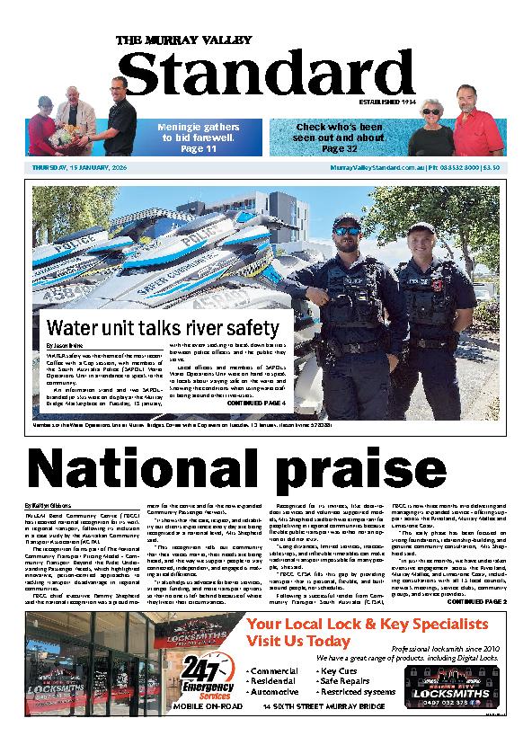 The Murray Valley Standard – 15th January 2026 Subscribe or Login to see the rest of the content. Username Password * Remember Me Forgot Password News MacKillop candidates revealed 03/03/2026 Nine candidates will contest the seat of MacKillop at the state election on 21 March. The official ballot draw was held in Bordertown on... Truck memorial returns 03/03/2026 The annual White Hill Truck Drivers Memorial is fast approaching, with volunteers preparing for the commemorative service that honours truck drivers lost on Australia’s... Ladies’ bowls competitive 03/03/2026 After a break in the season there is now only one round to complete the series of matches and there are still places to...
