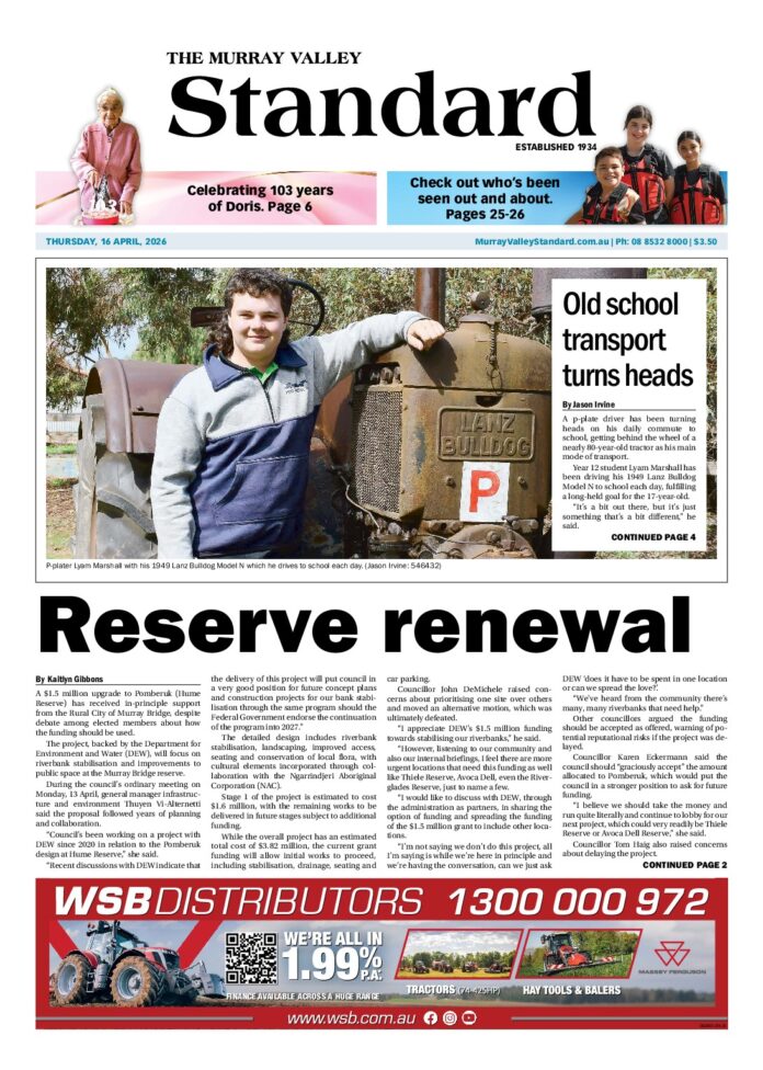 The Murray Valley Standard – 16th April 2026 Subscribe or Login to see the rest of the content. Username Password * Remember Me Forgot Password News Dog rego fees increase 19/04/2026 Dog owners across the region will pay more from July, after the Rural City of Murray Bridge approved a 3.3 per cent increase in... Walking for change 19/04/2026 A Murray Bridge woman is once again lacing up her walking shoes in support of autism awareness, committing to 10,000 steps a day throughout... Public sentiment shown 18/04/2026 A report has been presented to the Southern Mallee District Council (SMDC) following an extensive public consultation period regarding the proposed revocation of community...