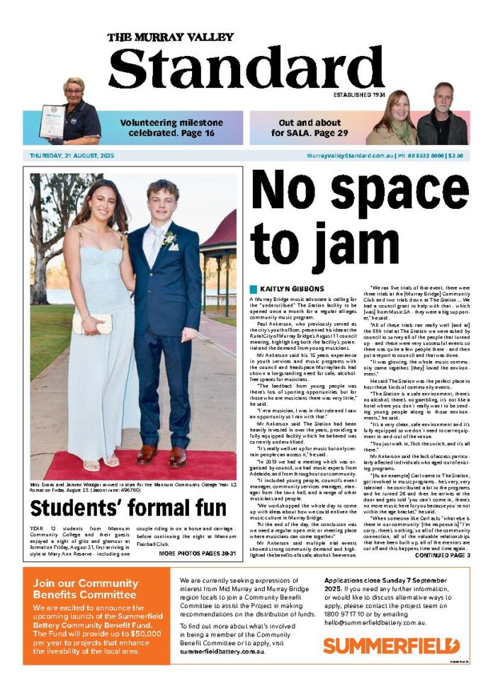 The Murray Valley Standard – 21st August 2025 Subscribe or Login to see the rest of the content. Username Password * Remember Me Forgot Password News Honouring our farmers 05/12/2025 To pay tribute to local primary producers doing it tough during the ongoing drought, the Tailem Bend Community Centre (TBCC) is hosting a community... Drink-driver stopped 05/12/2025 A man has been reported for alleged driving offences at Tailem Bend. About 7.40pm on Monday 29 November, police stopped a Holden sedan on Lime... Jervois jump up to second 05/12/2025 Murray Bridge has cemented its place at the top of the Lower Murray Bowling Association Division 1 standings with a commanding win against Mannum. Elsewhere,...