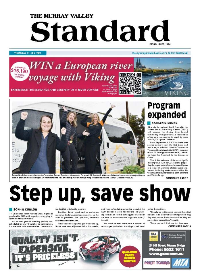 The Murray Valley Standard – 31st July 2025 Subscribe or Login to see the rest of the content. Username Password * Remember Me Forgot Password News Bunge sites open 05/12/2025 Bunge sites at Karoonda and Monarto South have welcomed their first deliveries for the 2025/26 harvest season. Bunge director industrial management Gavin Cavanagh... Honouring our farmers 05/12/2025 To pay tribute to local primary producers doing it tough during the ongoing drought, the Tailem Bend Community Centre (TBCC) is hosting a community... Drink-driver stopped 05/12/2025 A man has been reported for alleged driving offences at Tailem Bend. About 7.40pm on Monday 29 November, police stopped a Holden sedan on Lime...