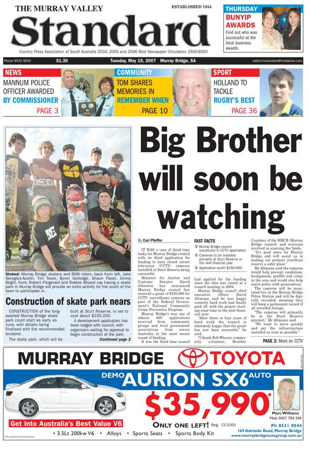 History: step back in time 17/05/2025 FacebookTwitterEmail Tuesday, May 15, 2007 BIG BROTHER WILL SOON BE WATCHING It was a case of third time lucky for Murray Bridge council with its […] Subscribe or Login to see the rest of the content. Username Password * Remember Me Forgot Password