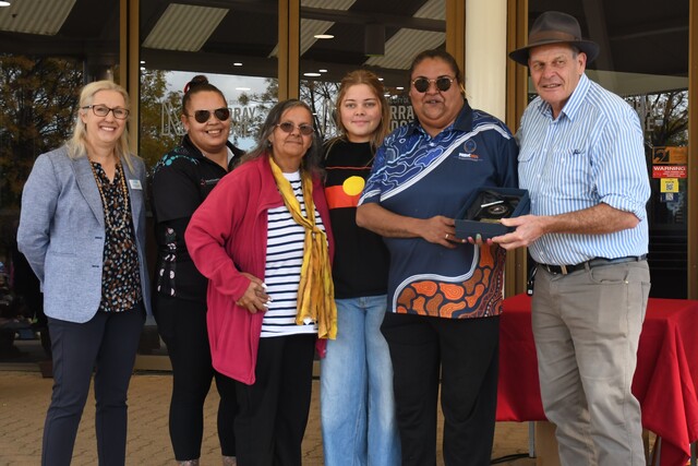 Rural City of Murray Bridge mayor Wayne Thorley (right) and deputy mayor Airlie Keen (left) presented Temeika Campbell, Aunty Ellen Trevorrow, Zemiah Campbell and Elizabeth Rankine with the Artist of the Year Award. (Sophie Conlon: 488759)