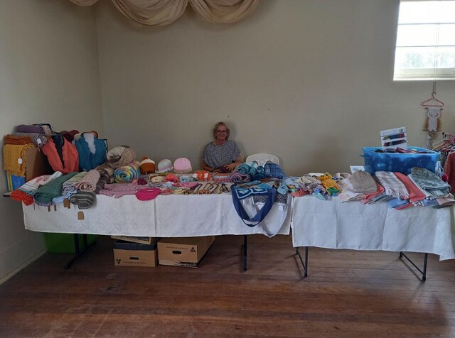 Wendy Wilkin-Hampel sells handmade woolen goods at Coomandook's Easter market earlier this year. (Supplied)
