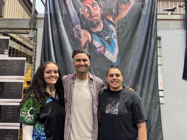 Ngarrindjeri Ruwe Empowered Communities program manager Amy Rogerson and youth and wellbeing facilitator Nekia Wilson with Chad Wingard.(Kaitlyn Gibbons: 495748)