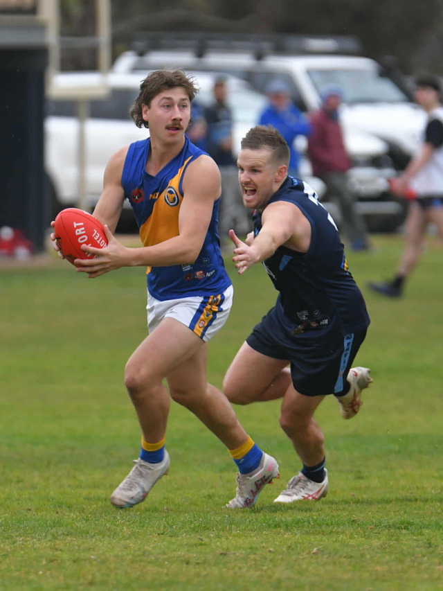 Daniel Zander, Tailem Bend, attempts to evade Jacob Rance, Imperials, during a round 16 RMFL A grade match-up. (William Bailey: 495636)