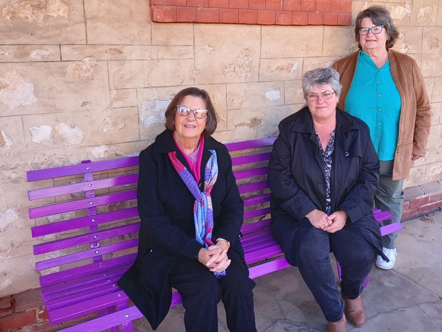 Lee Lyons from St John's Cathedral shares a spot on the purple bench with St John's Op Shop manager, Deb Rew and volunteer Ann French. (Supplied)