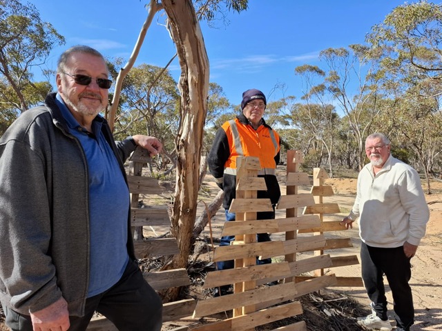 Karoonda Community Men's Shed president Gerry Paay with members Cliff Hosking and Malcom McKenzie are hard at work creating pallet Christmas trees. (Sophie Conlon: 492322)