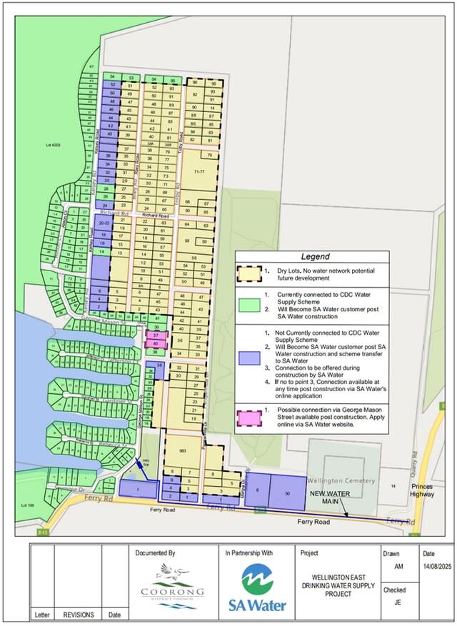 Map shows Wellington East water project: Green – currently connected, to become SA Water; Blue – not connected, can join during/after takeover; Yellow – potential future development; Pink – possible connection post-construction. (Supplied)