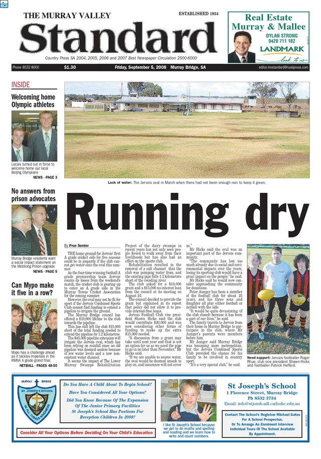 Turning back to 2008 05/09/2025 FacebookTwitterEmail 499358_01 Friday, September 5, 2008 RUNNING DRY The home ground for Jervois’ first A grade cricket side for five seasons could be in jeopardy if […] Subscribe or Login to see the rest of the content. Username Password * Remember Me Forgot Password