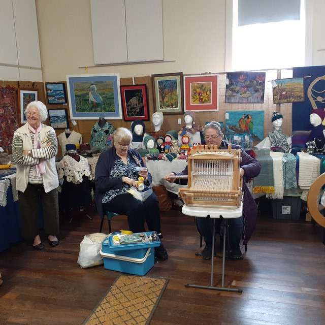 Bev Loeckenhoff, Meron Lewcock and Dianne Burbridge, all of Murray Bridge, demonstrated the arts of felting and weaving. Behind displayed on the wall were beautiful felted paintings by Robyn Smith, Mannum.