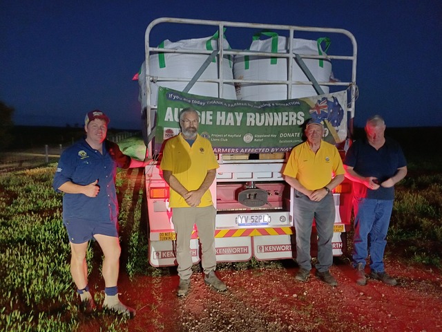 Mannum Lions president Jim Burford, middle left, and Lion Barry Burdett, middle right, with volunteer truck drivers from Heyfield Lions Club as they unload the feed on September 8. (Supplied)