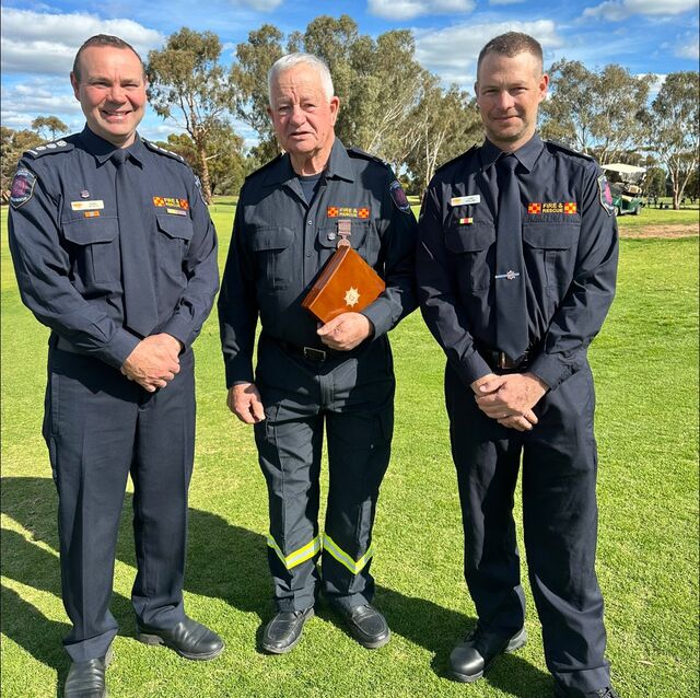 Mannum CFS volunteer Barry Burdett (middle) receives his 50-Year service medal from Swanport group officer Terry Schutz (left) and Mannum captain Luke Collins (right).