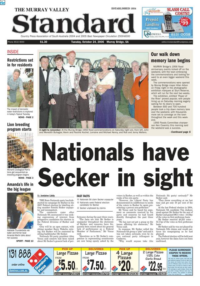 Standard headlines in 2006 26/10/2025 FacebookTwitterEmail Tuesday, October 24, 2006 OUR WALK DOWN MEMORY LANE BEGINS Murray Bridge’s 1956 flood anniversary events kicked off on the weekend, with the town […] Subscribe or Login to see the rest of the content. Username Password * Remember Me Forgot Password