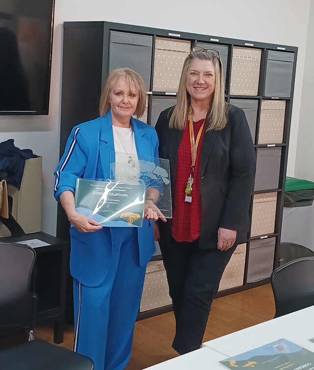 Enrolled nurse Darryl Canaway receives her certificate from Murray Bridge Soldiers’ Memorial Hospital director of nursing and midwifery Kristin Hunter. (Supplied)