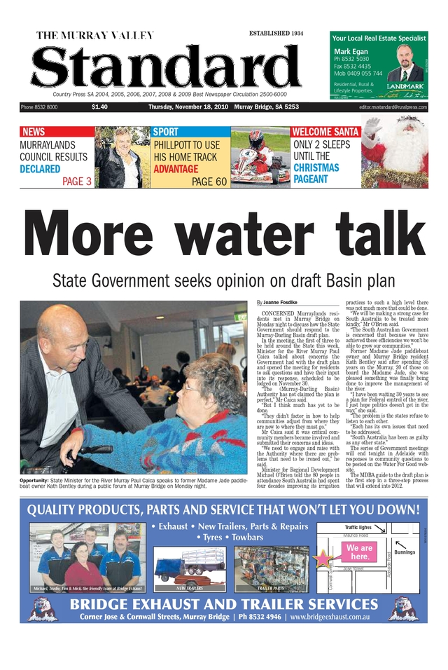 Local headlines in 2010 17/11/2025 FacebookTwitterEmail Thursday, November 18, 2010 MORE WATER TALK Concerned Murraylands residents met in Murray Bridge on Monday night to discuss how the State Government should […] Subscribe or Login to see the rest of the content. Username Password * Remember Me Forgot Password