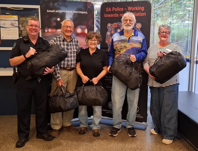 Senior Constable First Class David Brown with Rotarian Malcolm Blight, founder of Bags for Blokes Elizabeth Crawley and Rotarians Jim Cundy and Penny Heighes. (SAPOL)