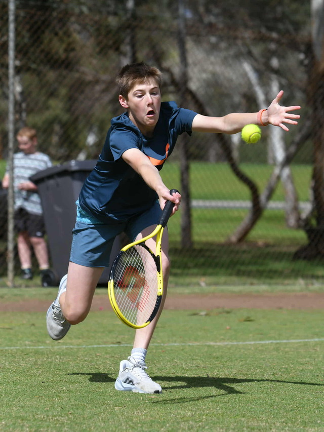 Nate Oster, Coorong, stretches to ensure he would make a forehand return in round four tennis action. (William Bailey: 516336)